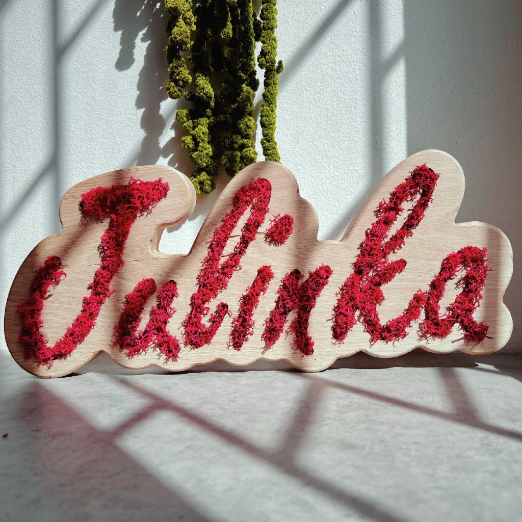 Whether it’s a personalized home decor piece for your living room, bedroom, or office, or a thoughtful gift for a friend or loved one, this custom wooden name cutout with stabilized moss adds a fresh and personal touch to any space.