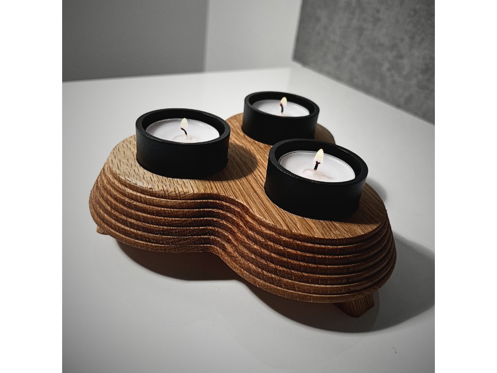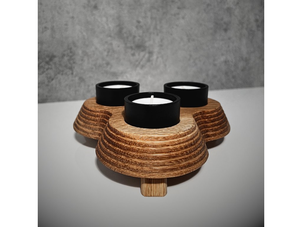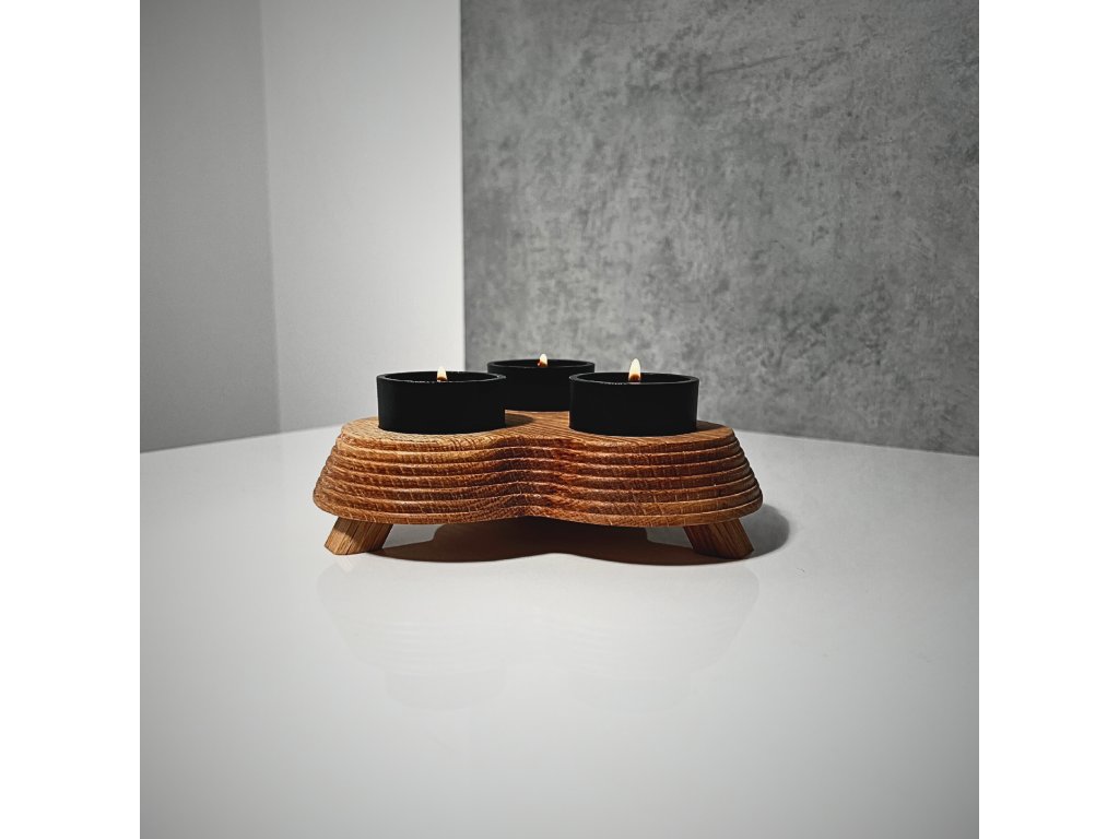 Dřevěný svícen na nožkách se třemi hliníkovými kalíšky