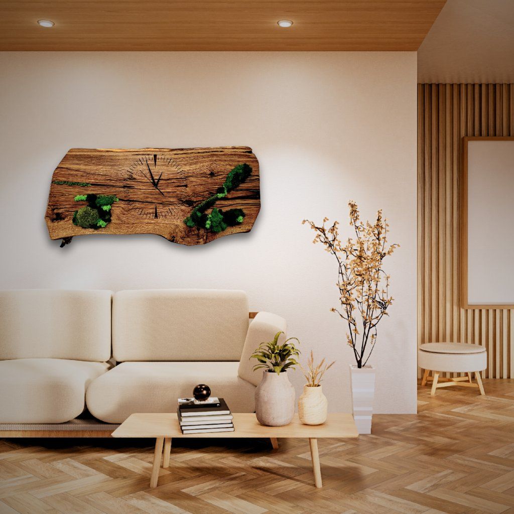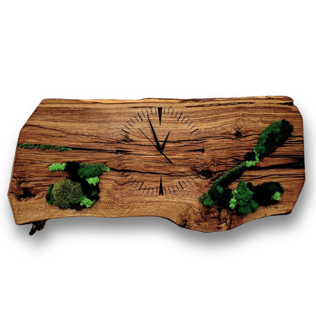 Long Reclaimed Oak Wall Clock with Stabilized Moss